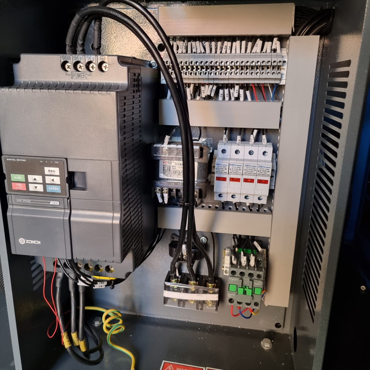 Частотний перетворювач (інвертор): Частотний перетворювач дає змогу регулювати швидкість обертання двигуна компресора, що так само дає змогу оптимізувати продуктивність відповідно до поточних потреб. Це дає змогу неабияк знизити енергоспоживання і знос обладнання.