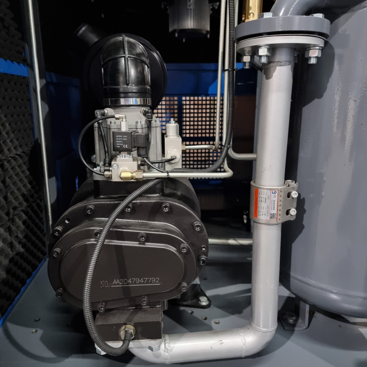 Двигун IE3: IE3 (Efficiency Class 3) — це клас ефективності для електродвигунів, що встановлюються на різне обладнання, включно з компресорами. Це означає, що двигун має високий ступінь ефективності та здатний знизити споживання електроенергії, порівнюючи з менш ефективними двигунами.