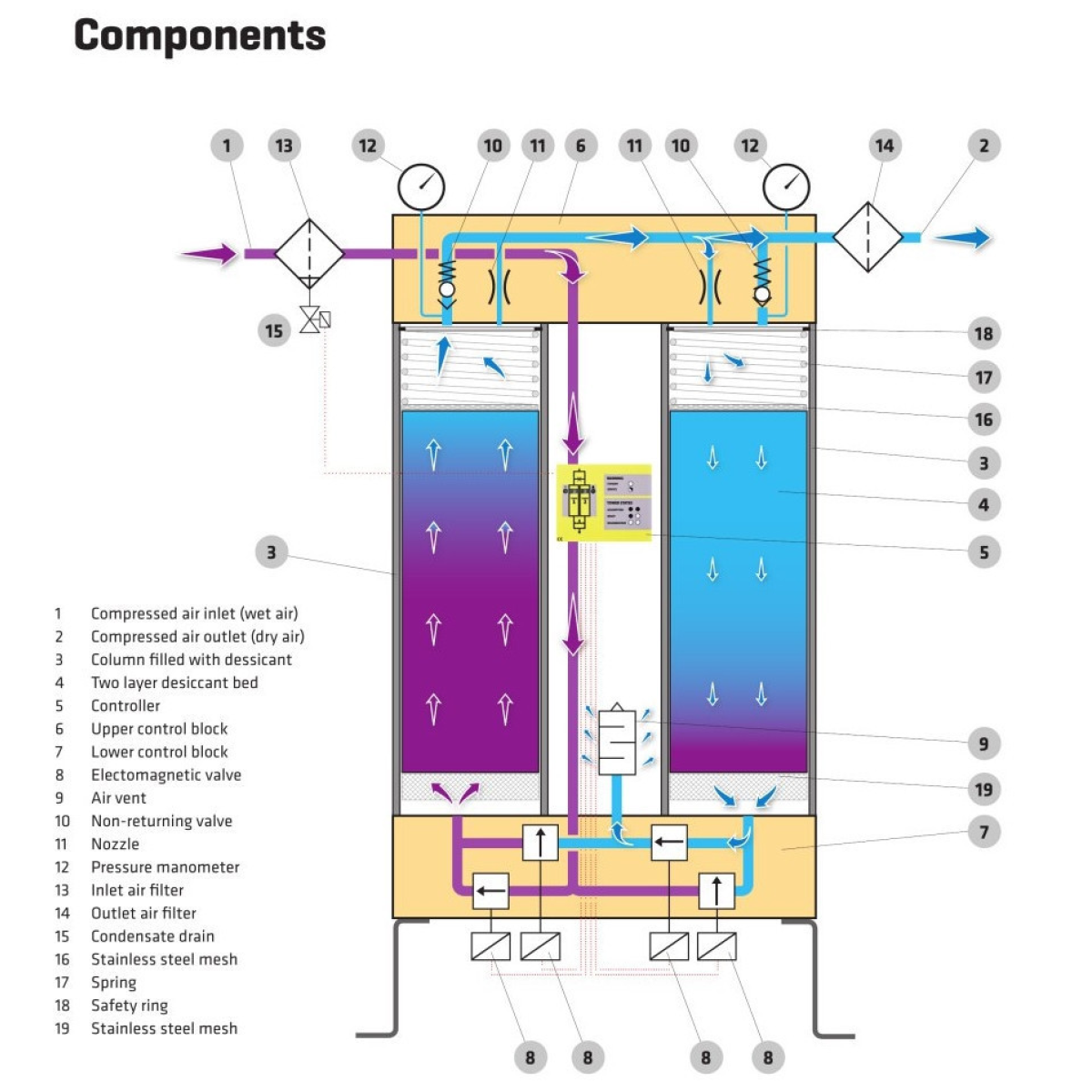 Адсорбційні осушувачі це пристрої розроблені для видалення вологи з стисненого повітря. На відміну від рефрижераторних осушувачів, після яких температура точки роси повітря знижується до +3С, адсорбційні осушувачі дозволяють отримати “глибоко“ осушене повітря, з температурою точки роси -70С. Як зрозуміло з назви, робота даних осушувачів основа на властивості поглинання твердим речовиною - адсорбентом, рідини з стисненого повітря.