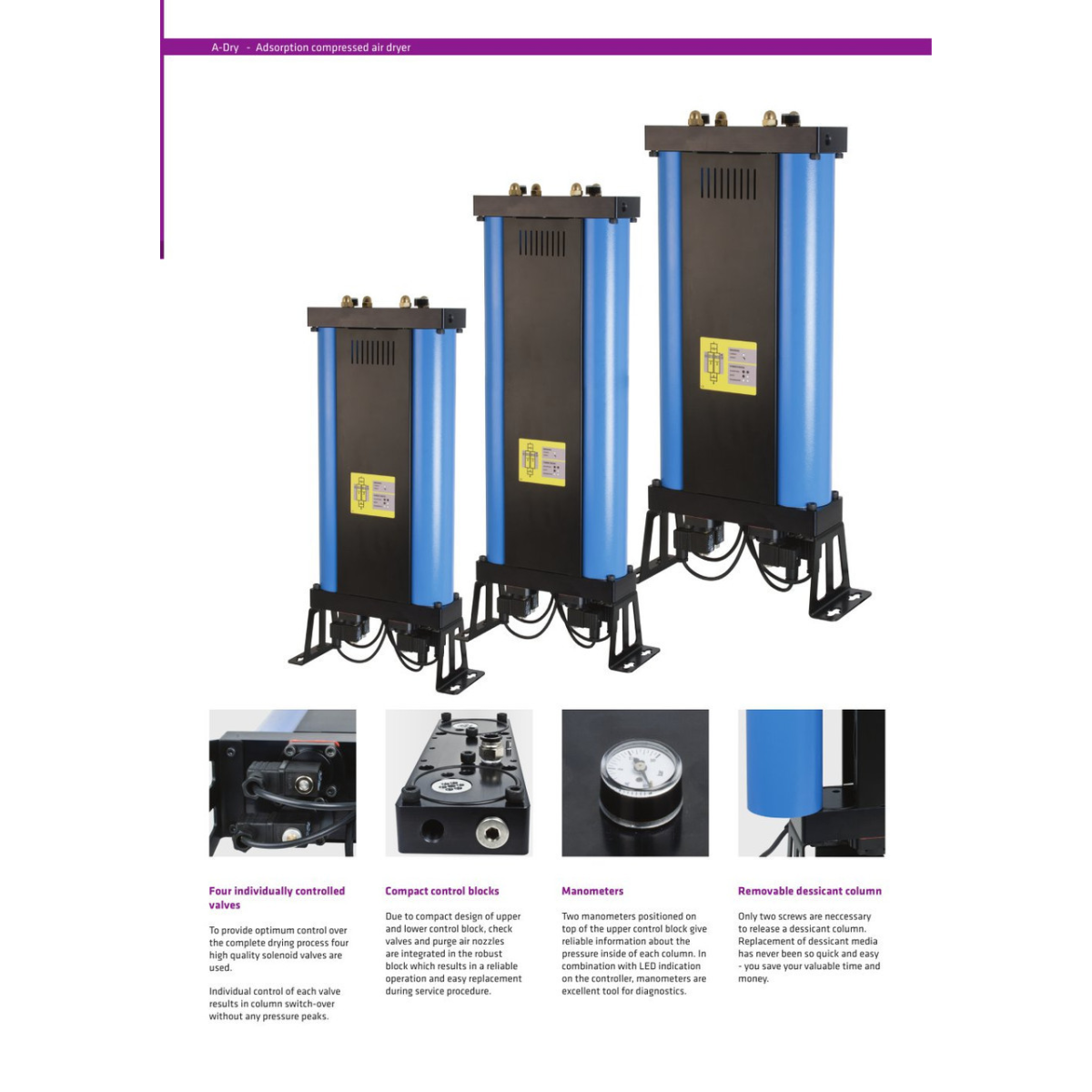 Осушувачі моделі A-DRY розроблені для застосування з компресорами продуктивністю до 105 М3/год (до 11 кВт). Область їх застосування досить широка. Існує величезна кількість технологічних процесів, де пневматичне обладнання, запірна арматура з пневматичними приводами, працює при температурі навколишнього середовища. Експлуатація даного обладнання допустима, в таких умовах, тільки при осушенном повітрі до температури т. р. нижче -25 С (для нашої кліматичної зони).
